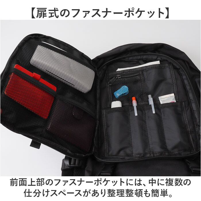 ・前面上部のファスナーポケットには、中に複数の仕分けスペースがあり整理整頓も簡単。