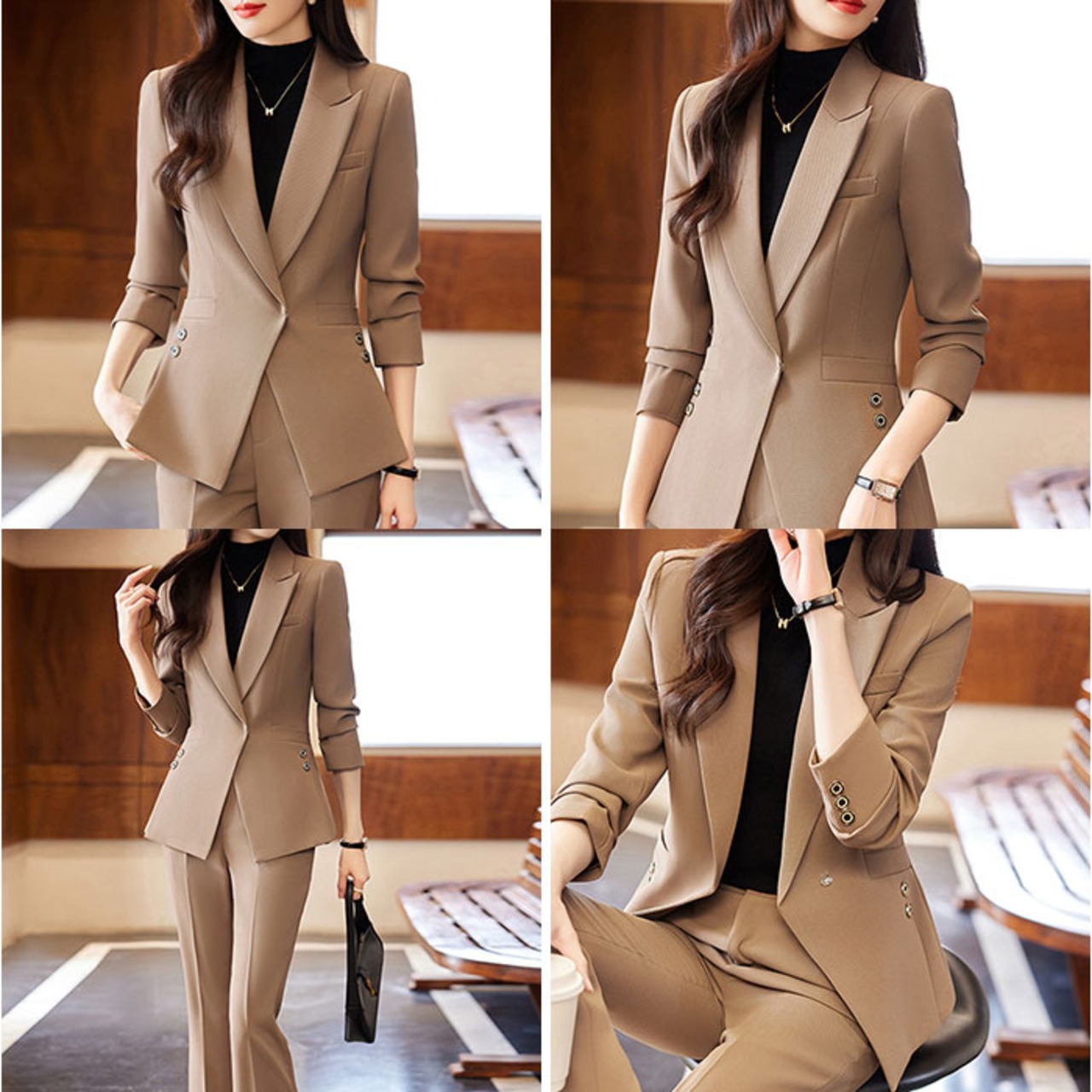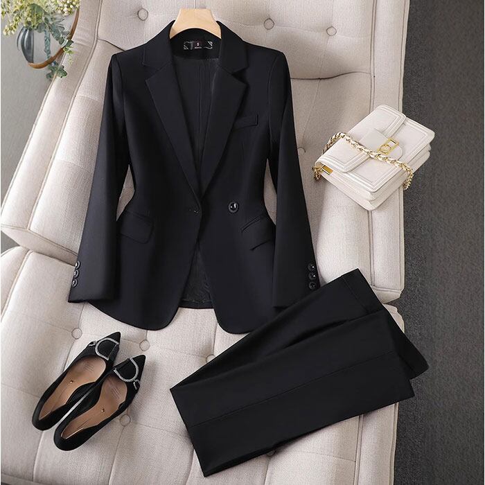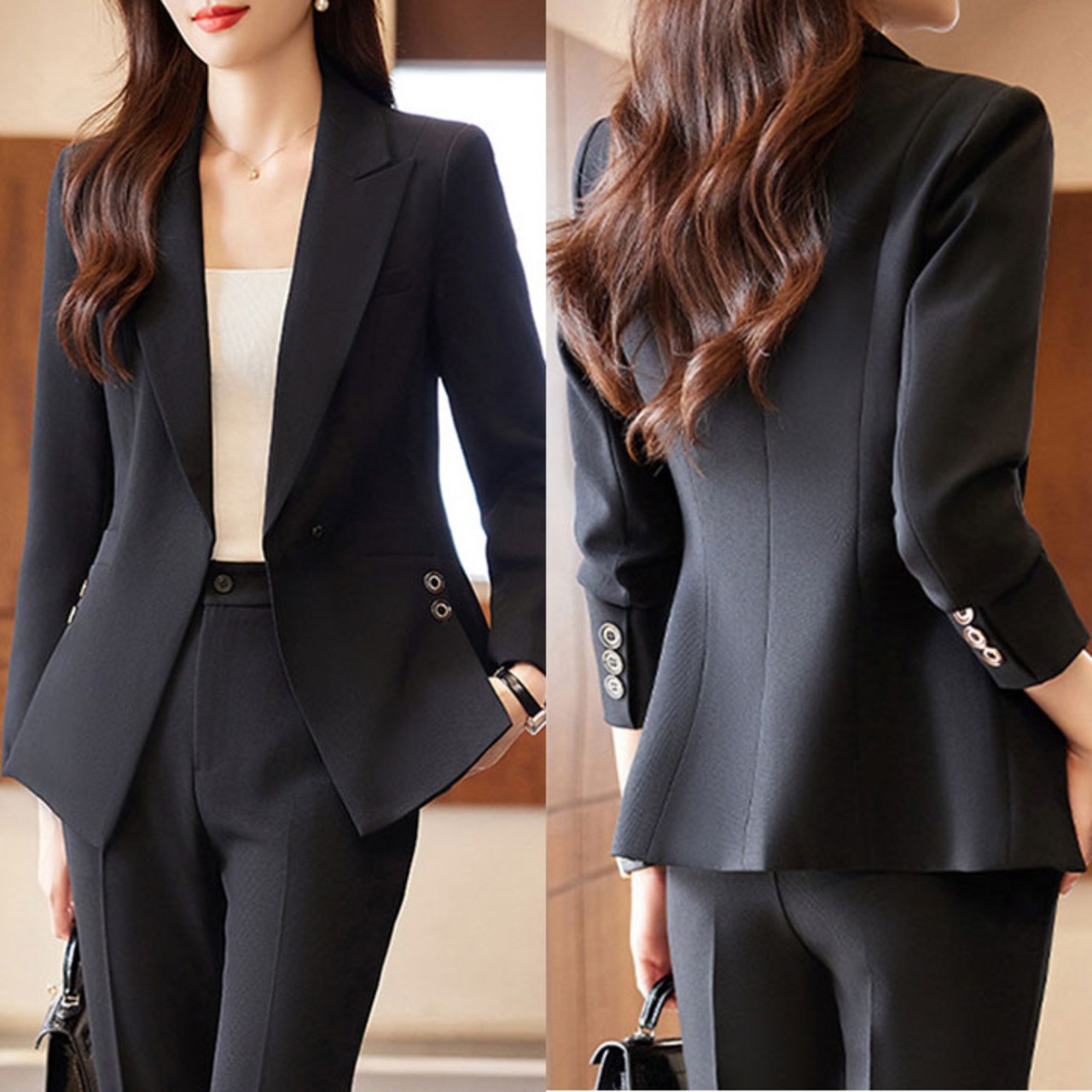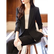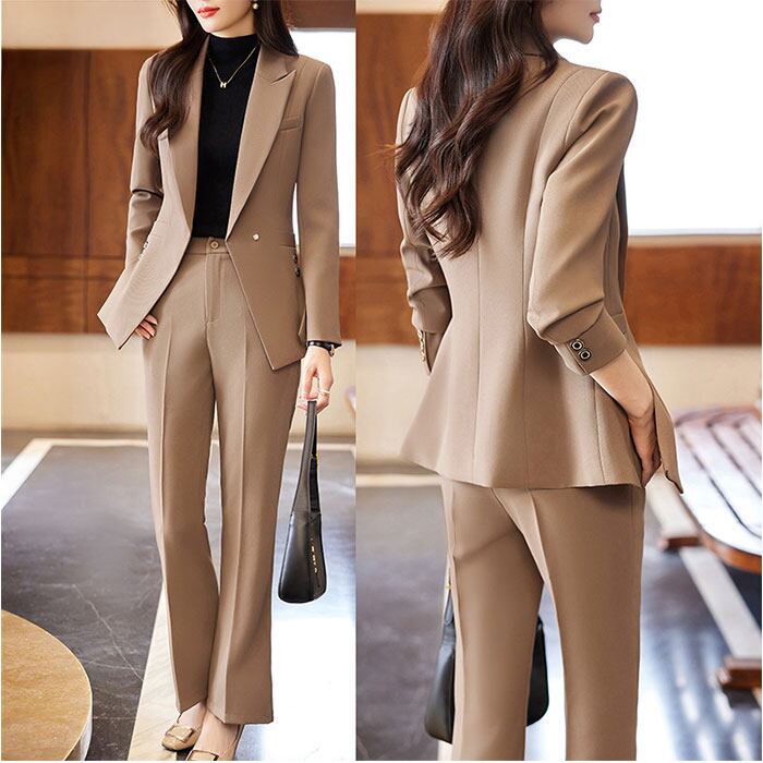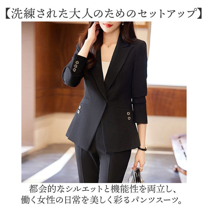 【洗練された大人のためのセットアップ】 都会的なシルエットと機能性を両立し、働く女性の日常を美しく彩るパンツスーツ。