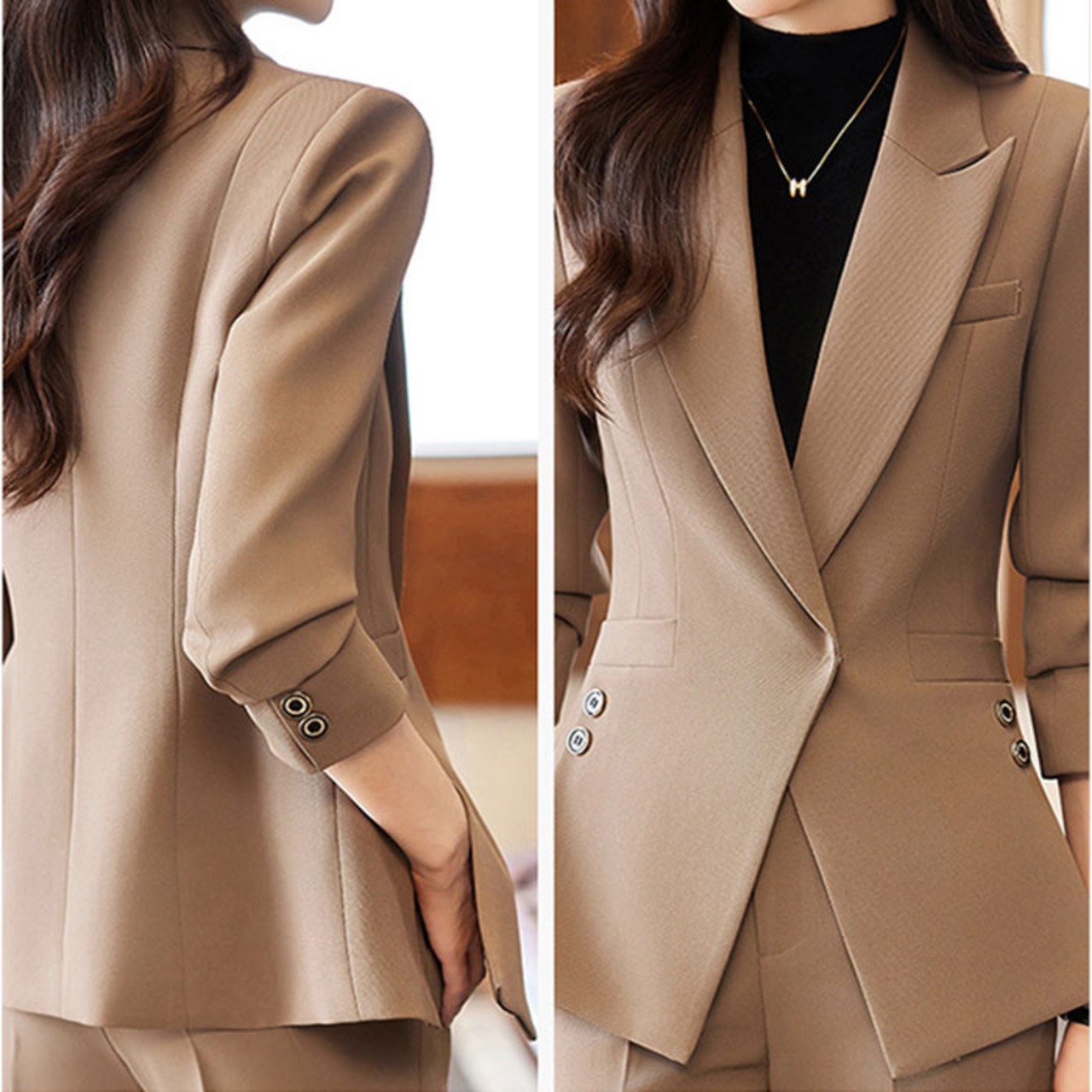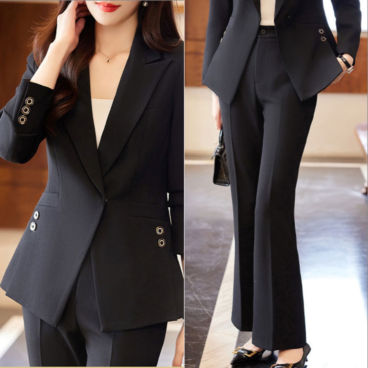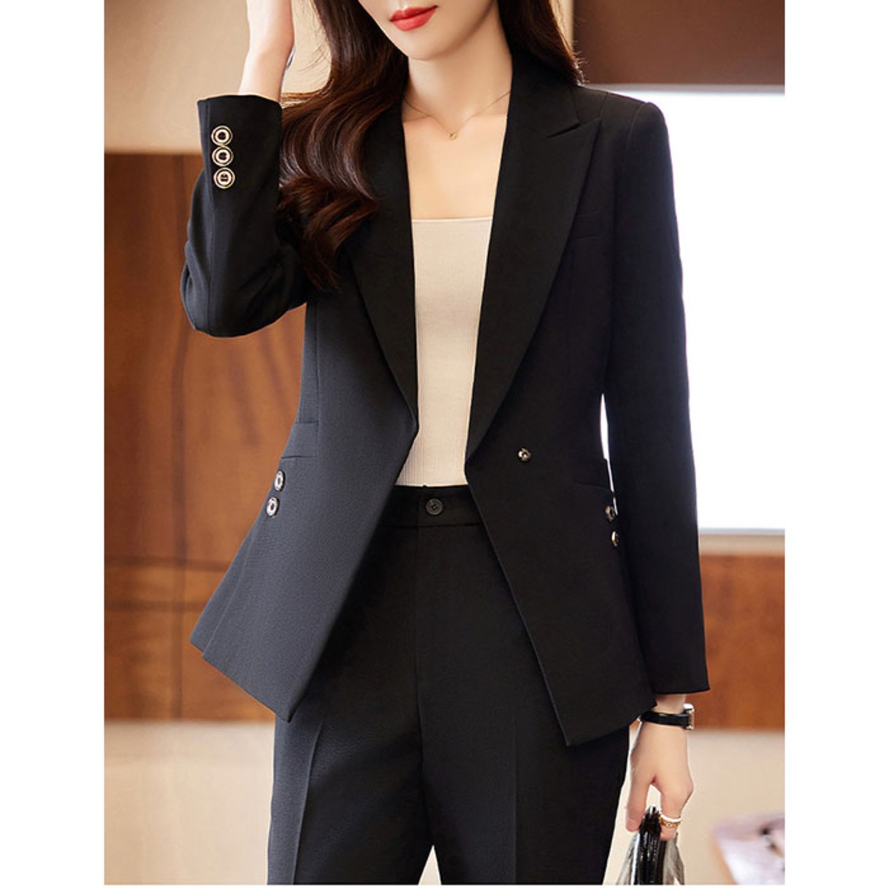 【洗練された大人のためのセットアップ】 都会的なシルエットと機能性を両立し、働く女性の日常を美しく彩るパンツスーツ。