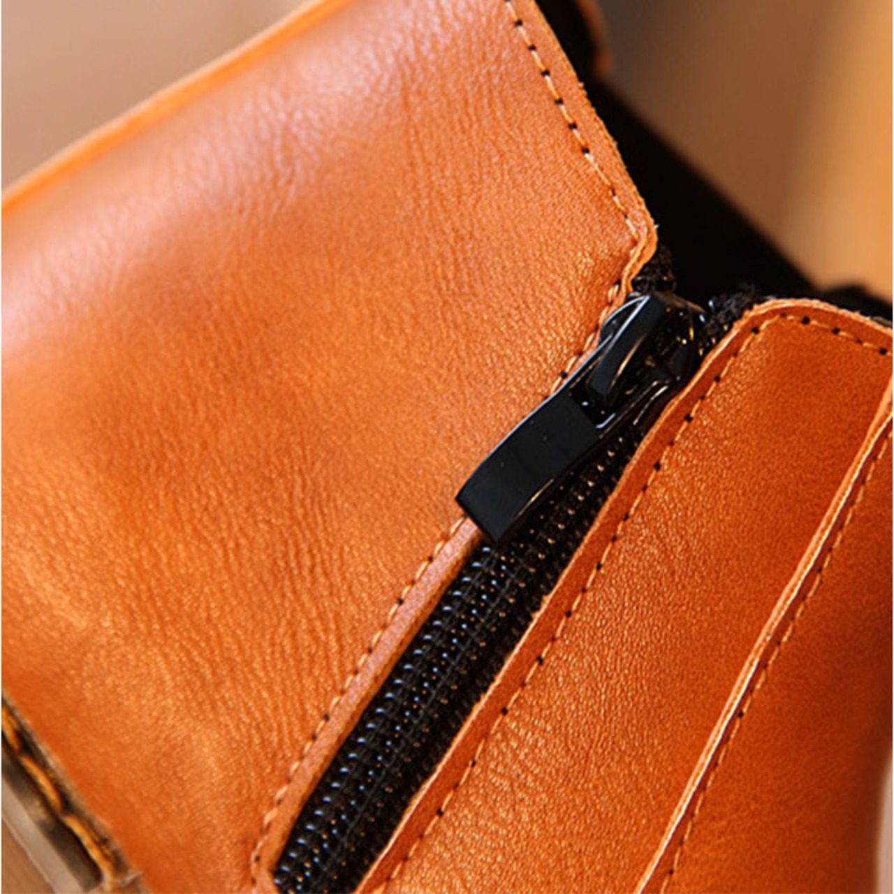 ・手触りなめらかなPU素材に、落ち着きのあるカラーで大人な雰囲気に仕上げたブーツ。