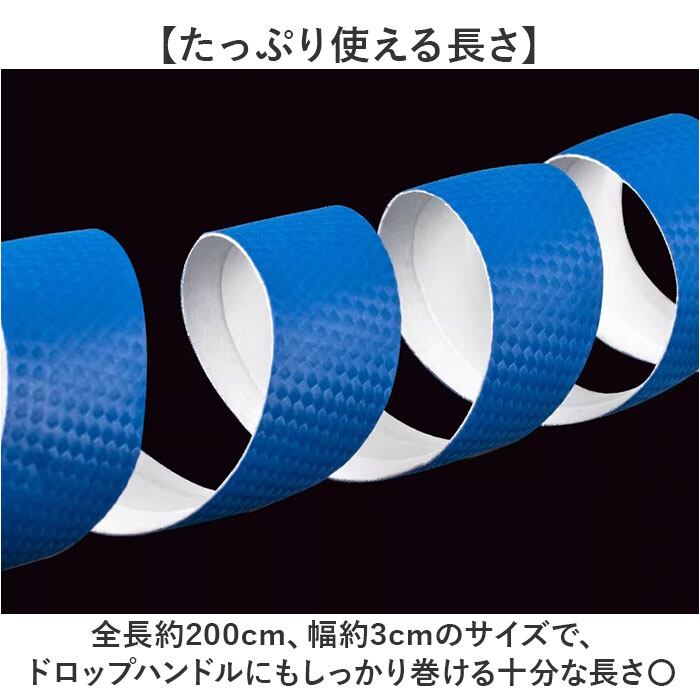 ・全長約200cm、幅約3cmのサイズで、ドロップハンドルにもしっかり巻ける十分な長さ〇