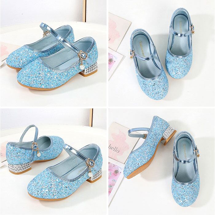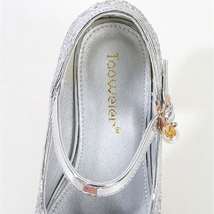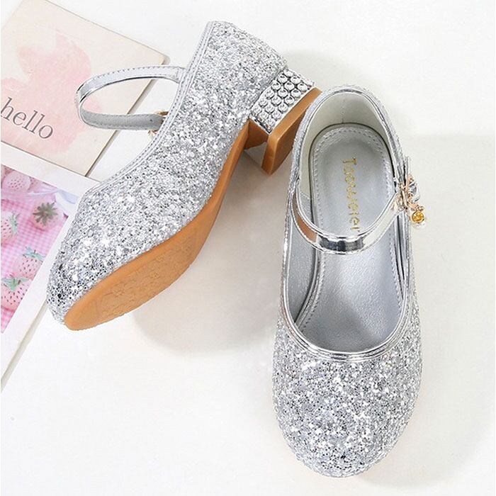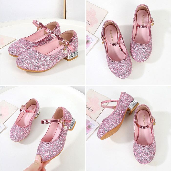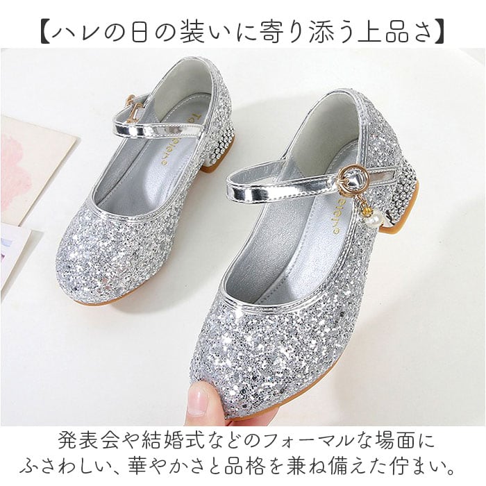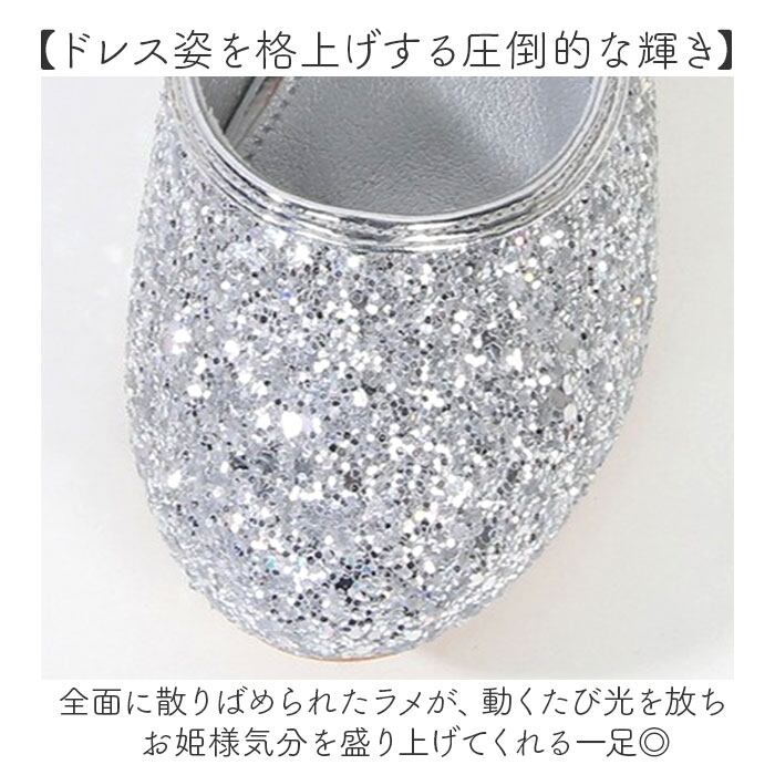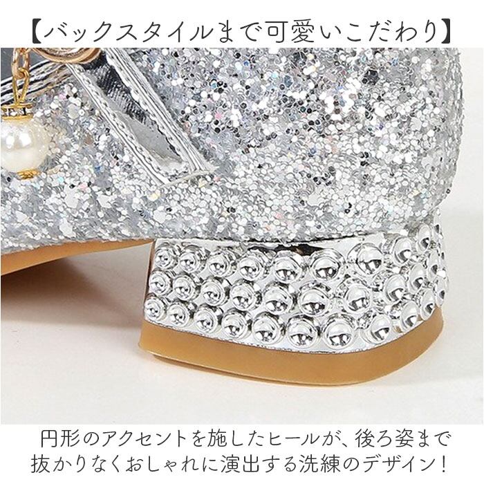 【特別な日を彩る魔法の輝きシューズ】 煌めくラメと優雅なヒールが主役級の存在感。ハレの日を彩るガールズパンプス。