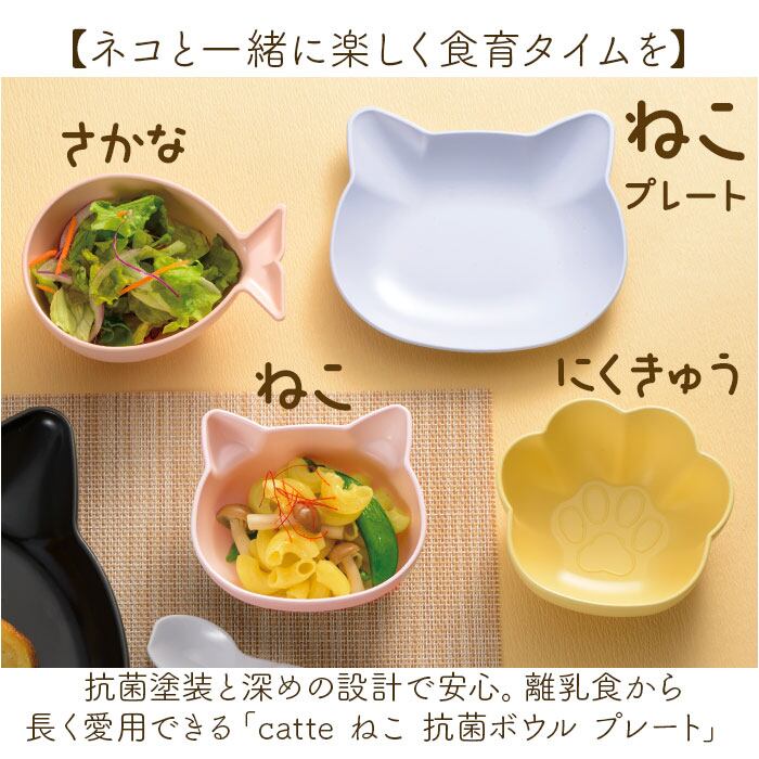 【ネコと一緒に楽しく食育タイムを】 抗菌塗装と深めの設計で安心。離乳食から長く愛用できる「catte ねこ 抗菌ボウル プレート」。