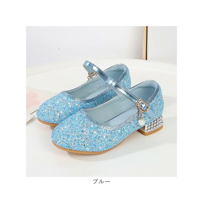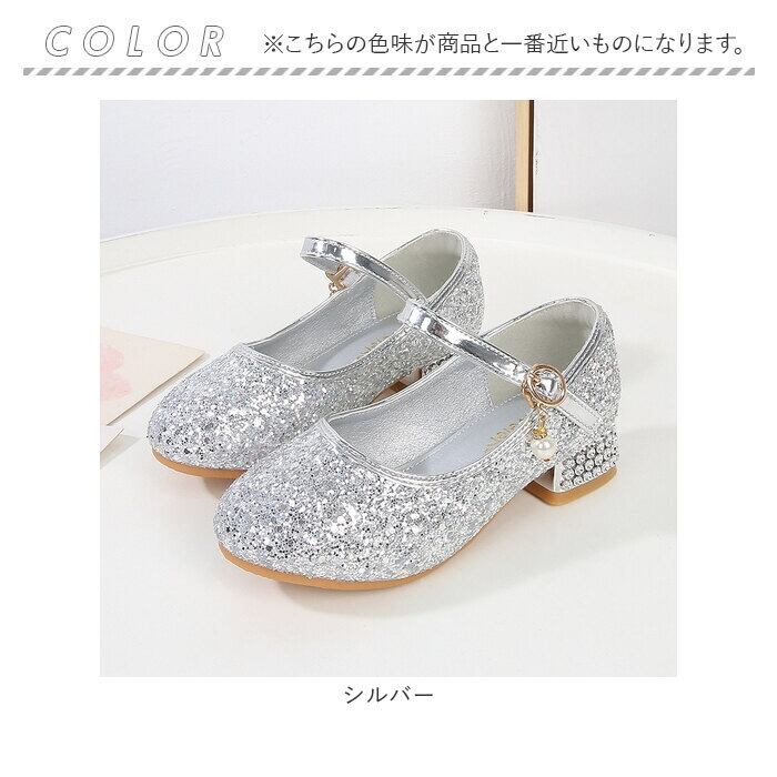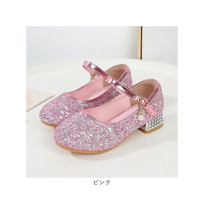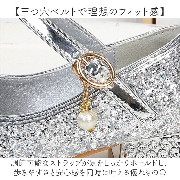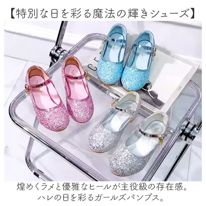 【特別な日を彩る魔法の輝きシューズ】 煌めくラメと優雅なヒールが主役級の存在感。ハレの日を彩るガールズパンプス。