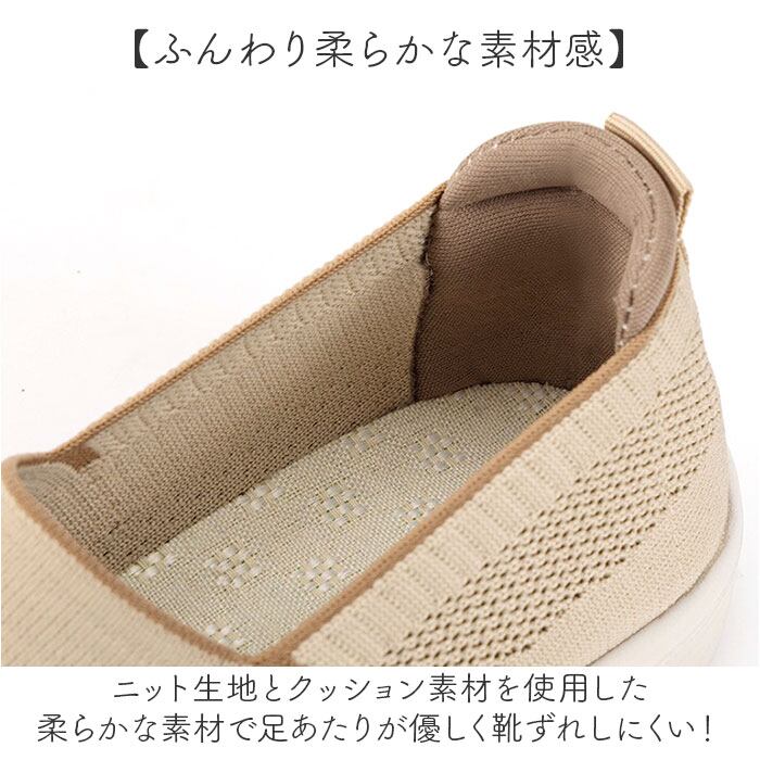 ・ニット生地とクッション素材を使用した柔らかな素材で足あたりが優しく靴ずれしにくい嬉しいつくり!