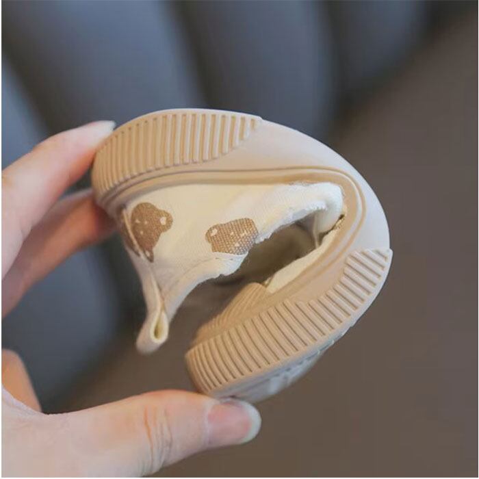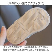 【滑りにくい底でアクティブに】 グリップ力の高いソールが地面をしっかり捉え、園庭での駆けっこも思い切り楽しめる安心感。〇