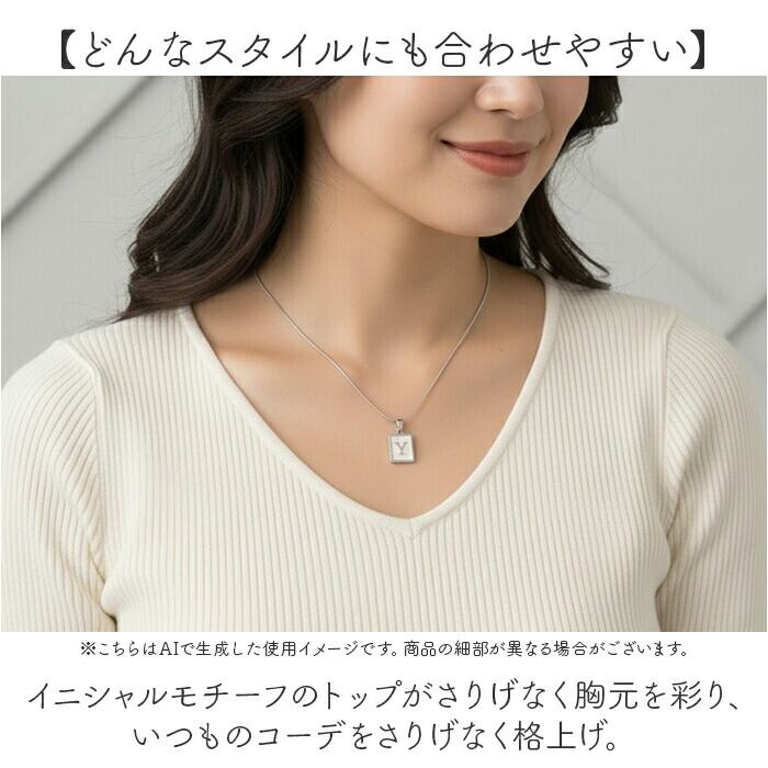 ・イニシャルモチーフのトップがさりげなく胸元を彩り、いつものコーデをさりげなく格上げ。
