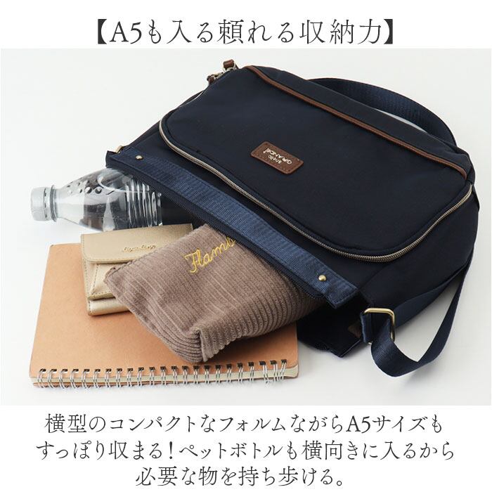・横型のコンパクトなフォルムながらA5サイズもすっぽり収まる!ペットボトルも横向きに入るから必要な物を持ち歩ける。