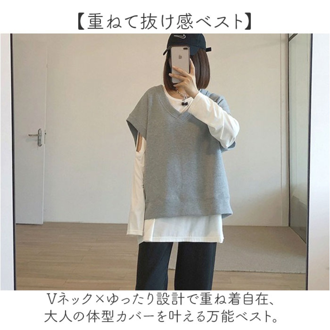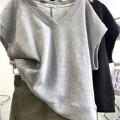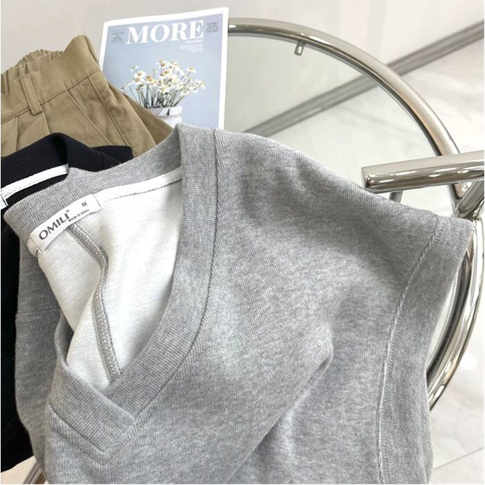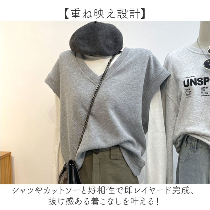 ・Vネック×ゆったり設計で重ね着自在、大人の体型カバーを叶える万能ベスト。