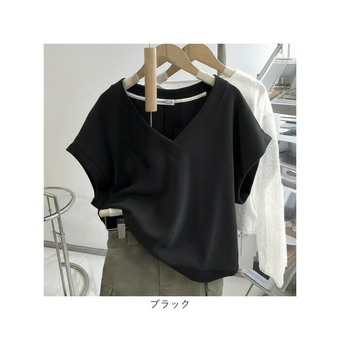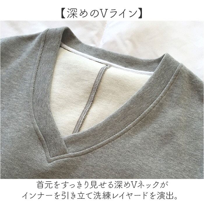 ・首元をすっきり見せる深めVネックがインナーを引き立て洗練レイヤードを演出実現的。
