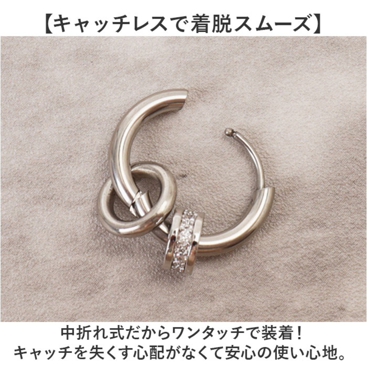 ・中折れ式だからワンタッチで装着!キャッチを失くす心配がなくて安心の使い心地。