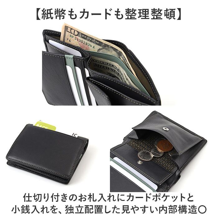 ・仕切り付きのお札入れにカードポケットと小銭入れを、独立配置した見やすい内部構造〇
