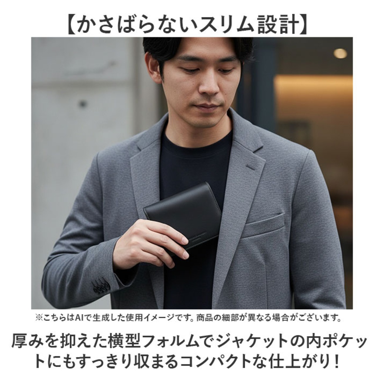 ・厚みを抑えた横型フォルムでジャケットの内ポケットにもすっきり収まるコンパクトな仕上がり!