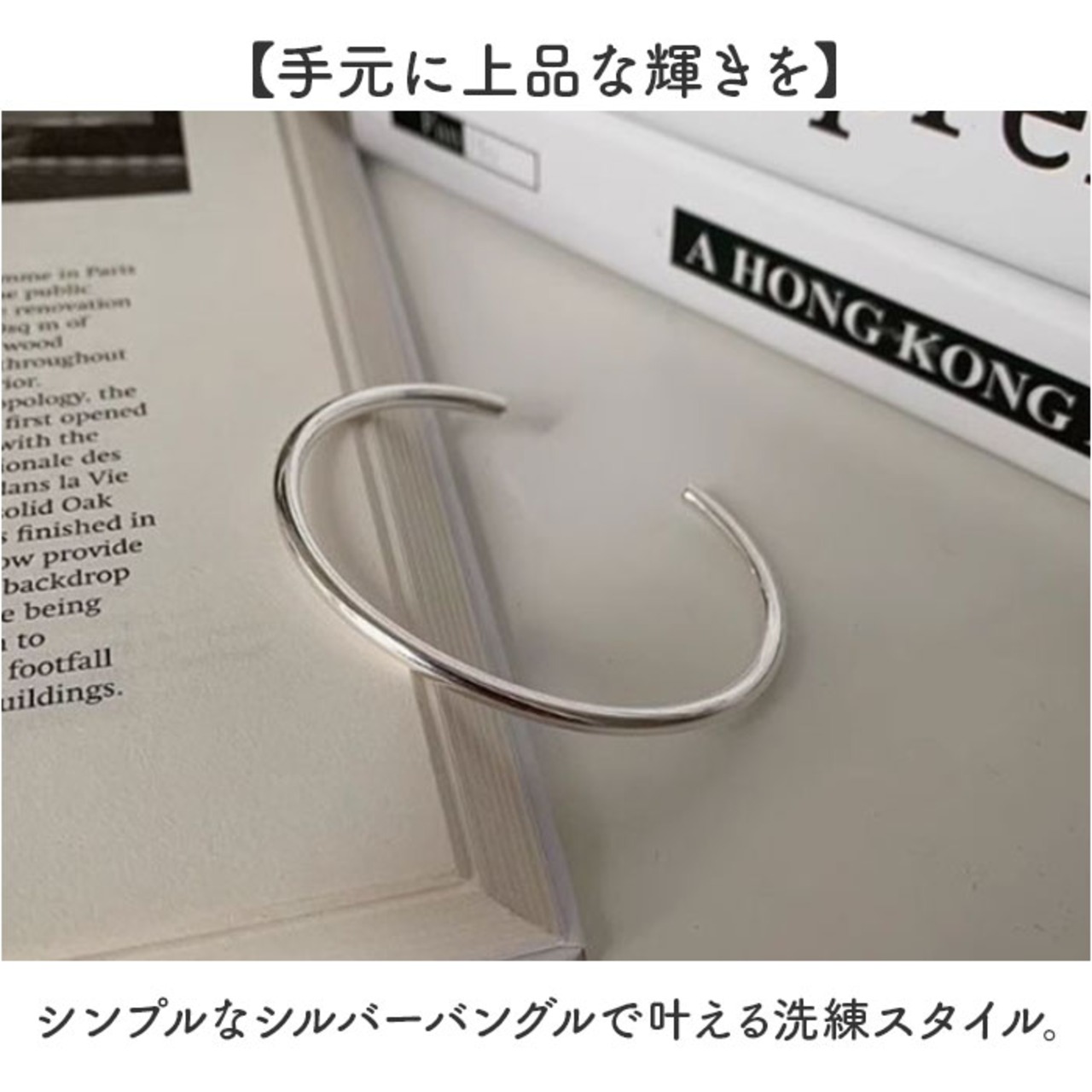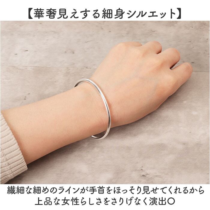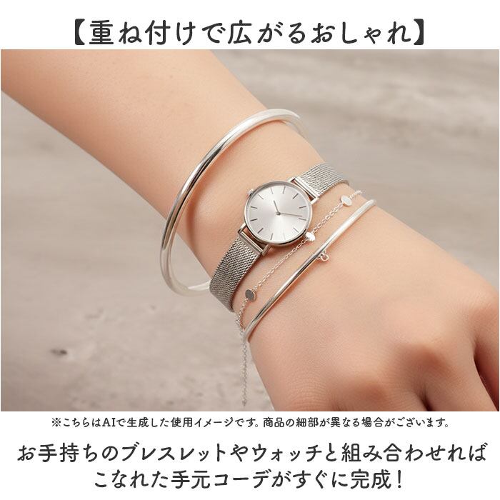 ・シンプルなシルバーバングルで叶える洗練スタイル。