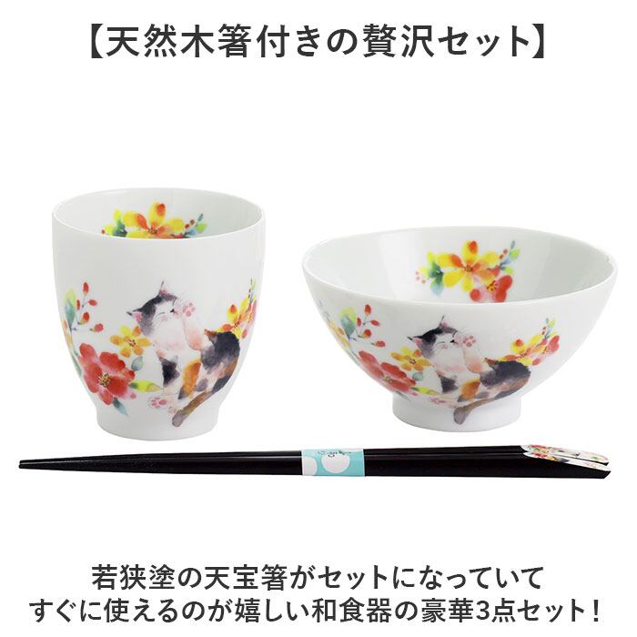 ・猫好きが喜ぶ日本製3点セット「天宝箸付飯碗湯呑セット」。