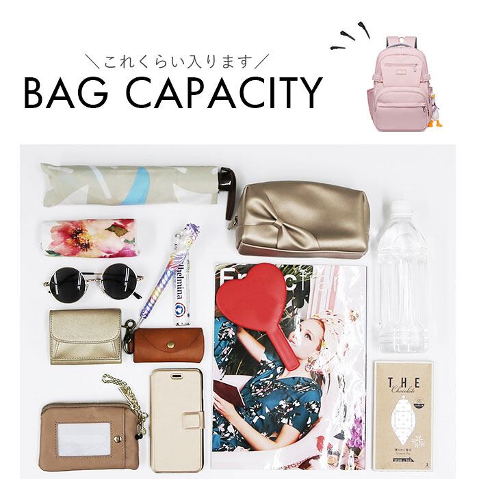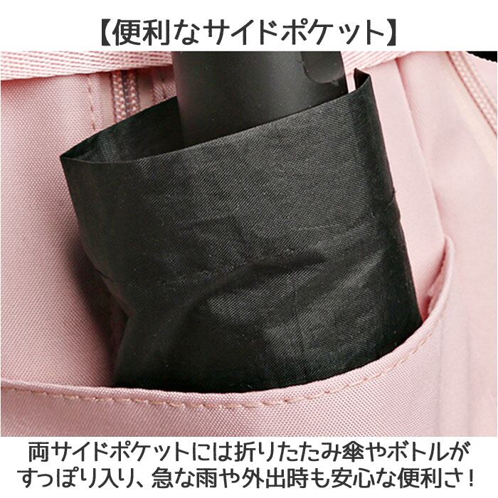 ・両サイドポケットには折りたたみ傘やボトルがすっぽり入り、急な雨や外出時も安心な便利さ!