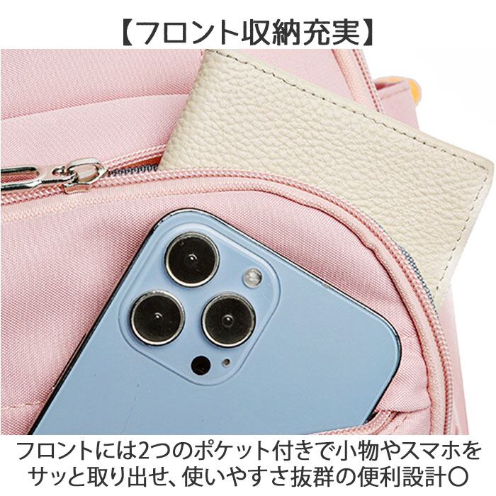 ・フロントには2つのポケット付きで小物やスマホをサッと取り出せ、使いやすさ抜群の便利設計〇