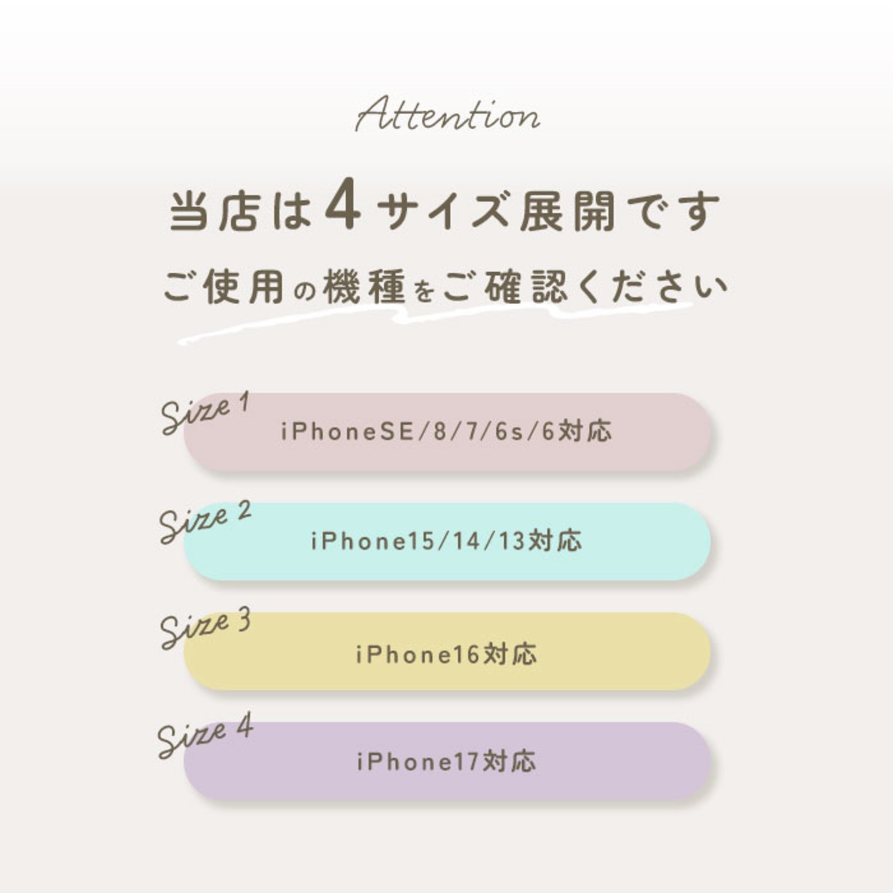 ・「iPhoneSE/8/7/6s/6対応」と「iPhone15/14/13対応」、「iPhone16対応」、「iPhone17対応」の4タイプ。