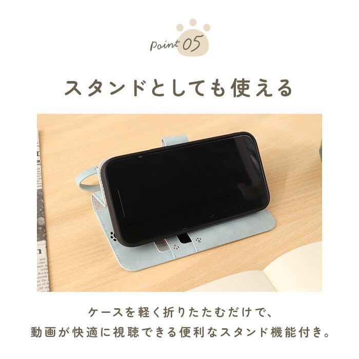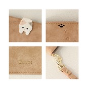 ・フラップ上部にフタを閉じたまま通話ができる、肉球をかたどったスピーカーホール付き。そのほかケースの随所に肉球マークの型押しを施し、細部までこだわったつくりにも要注目。