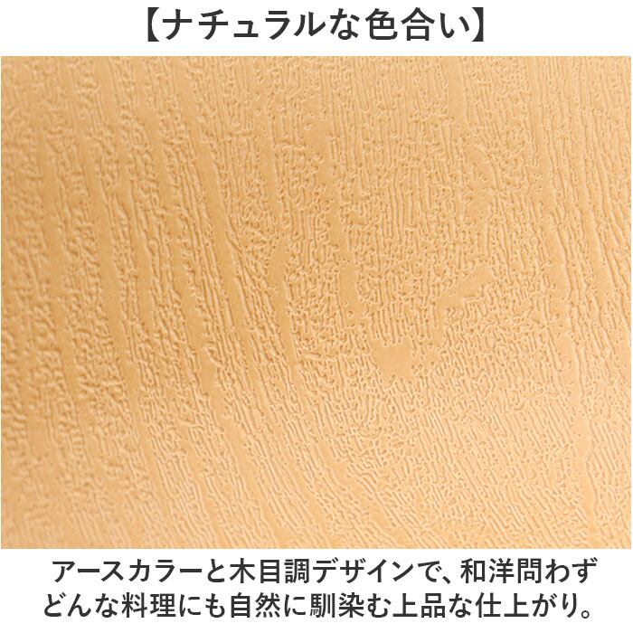 ・アースカラーと木目調デザインで、和洋問わずどんな料理にも自然に馴染む上品な仕上がり。
