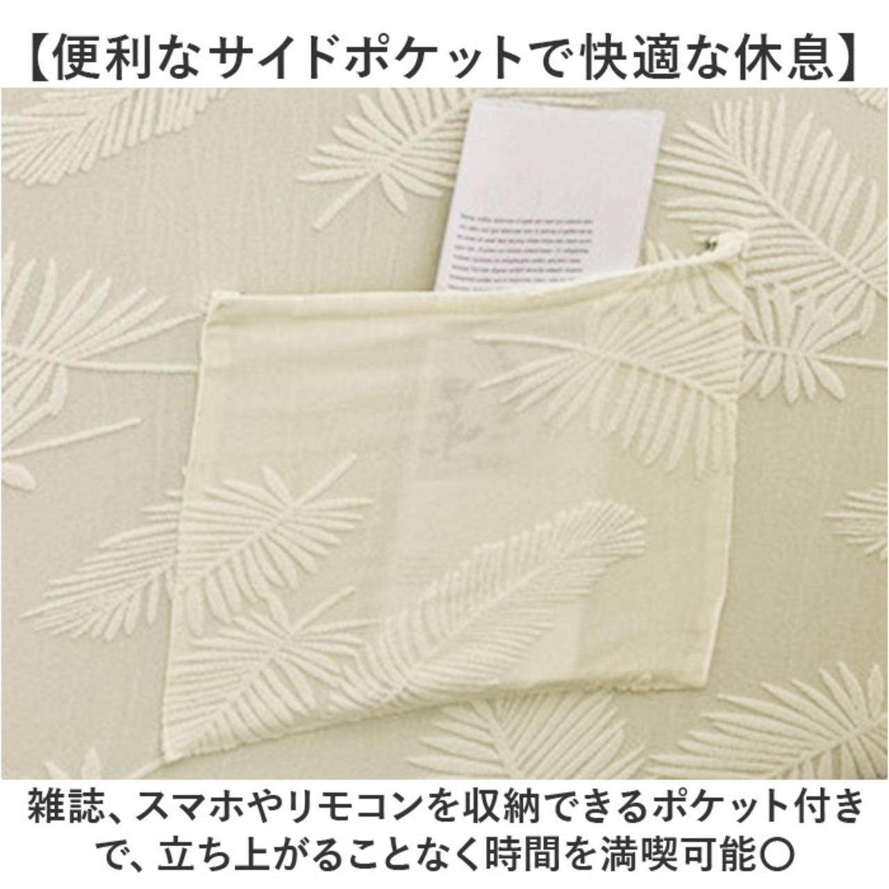 ・雑誌、スマホやリモコンを収納できるポケット付きで、立ち上がることなく時間を満喫可能〇