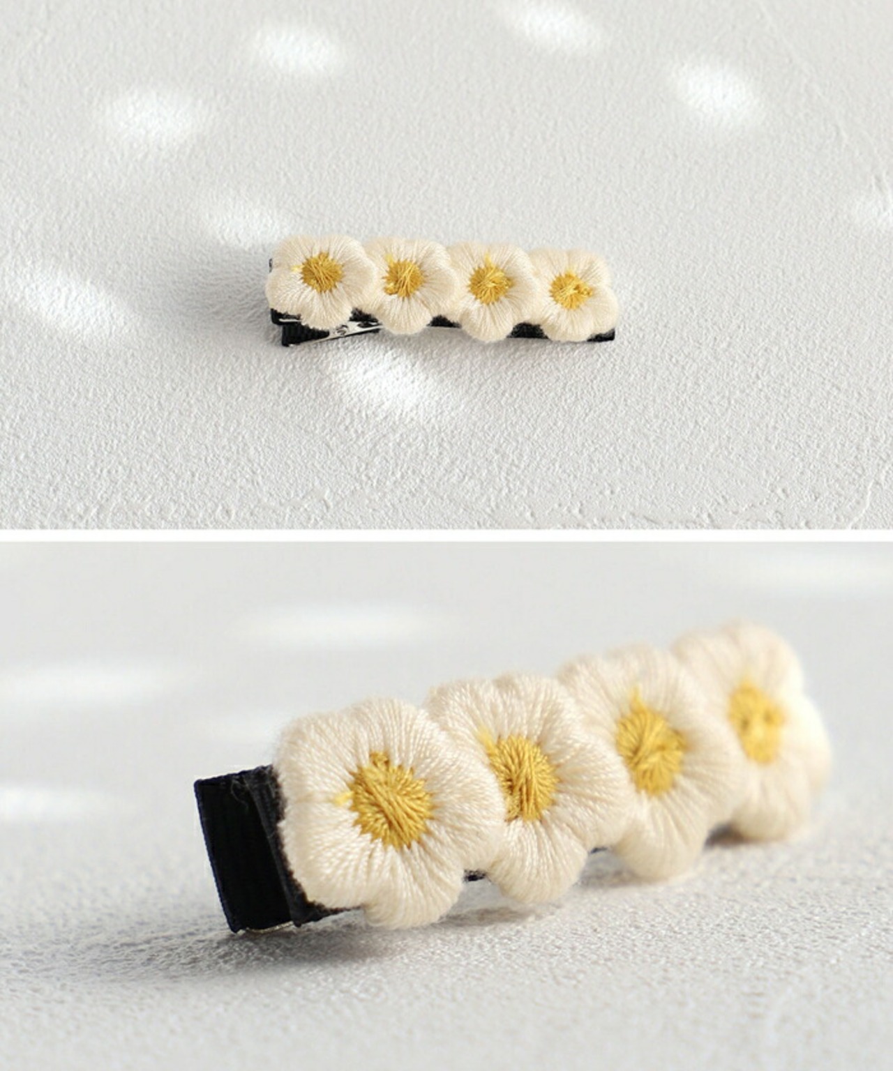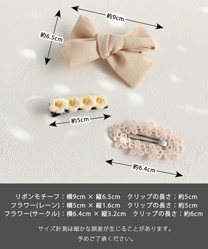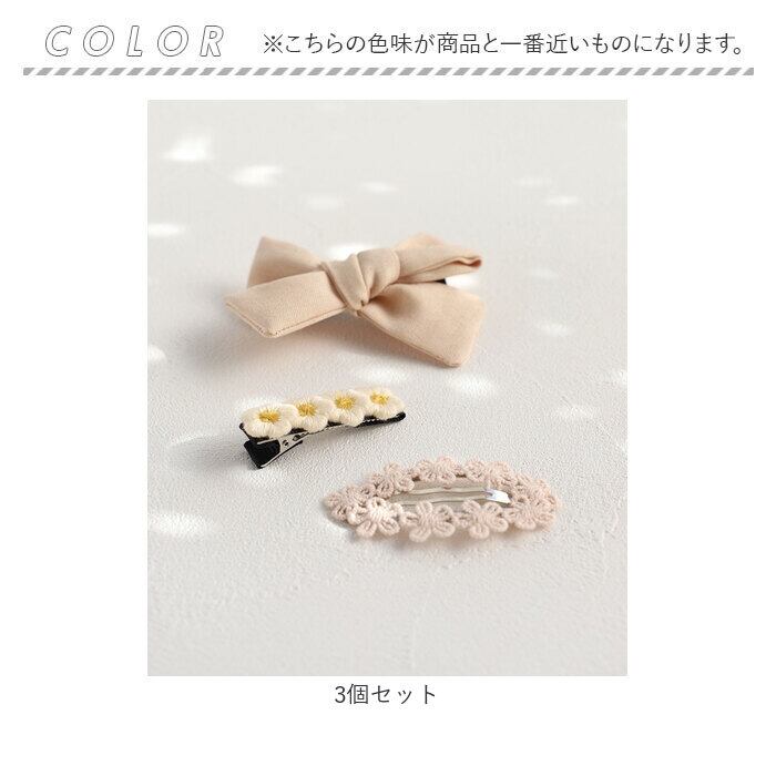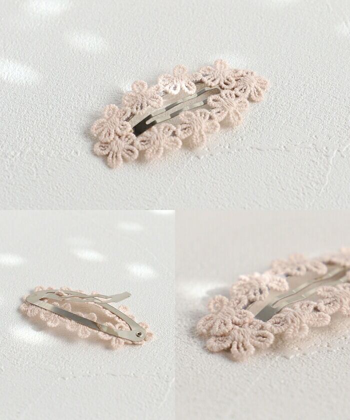 ・淡いカラーが上品なリボンクリップ、 可憐な小花が並んだ刺繍クリップ、 そして繊細なレースの小花パッチン留めの計3種類。