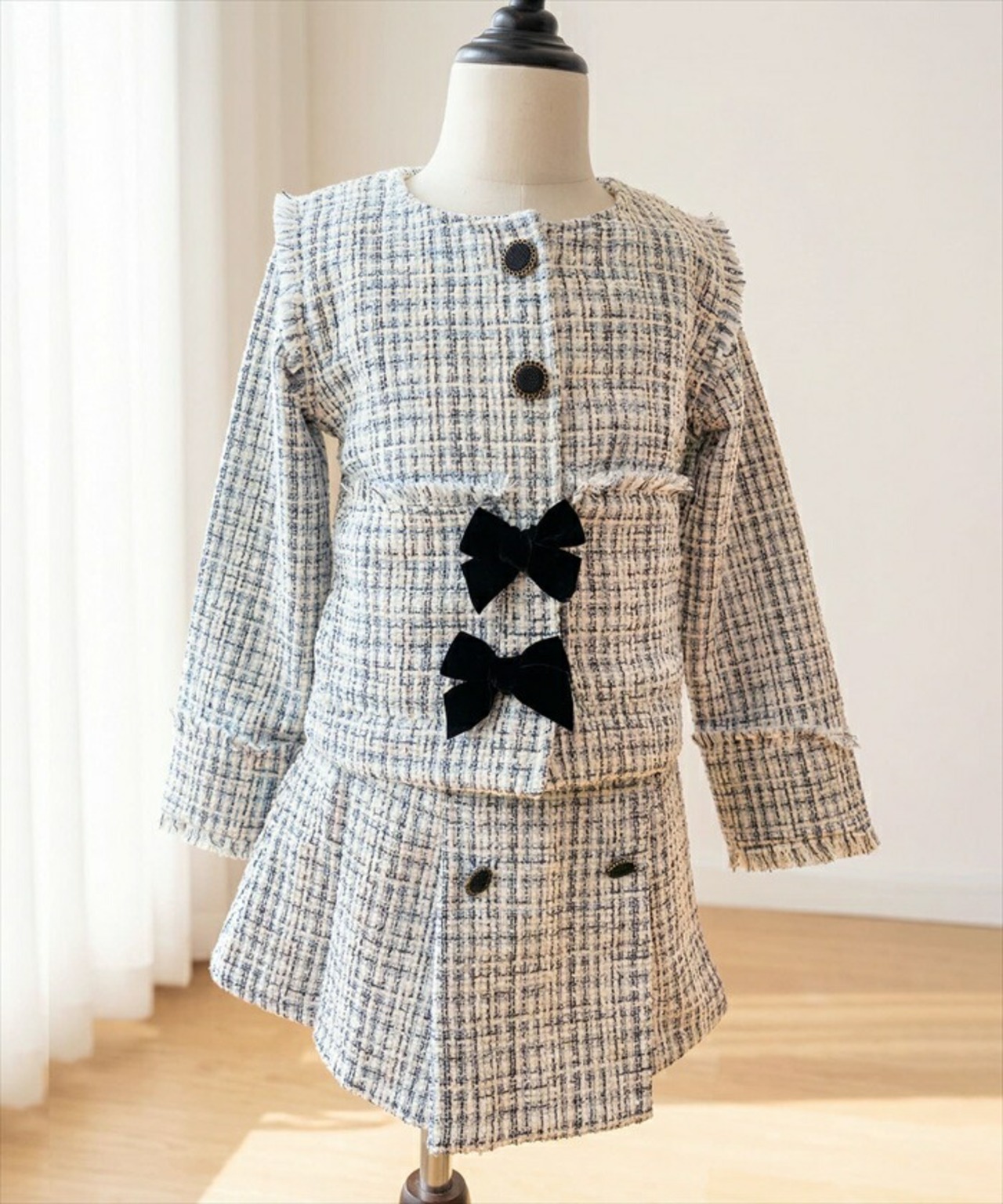 ・ホワイトをベースとして、柔らかなサックスとブラックのチェックが大人っぽく、卒園式や入学式などの特別なシーンにぴったり。