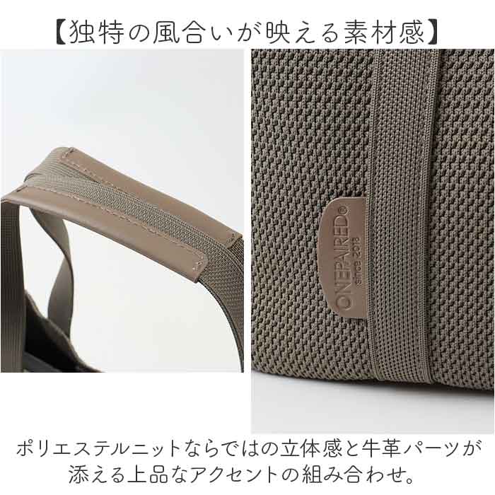 ・ポリエステルニットならではの立体感と牛革パーツが添える上品なアクセントの組み合わせ。