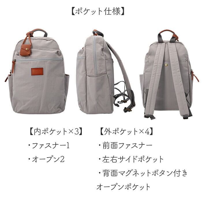 ・ポケット仕様…内ポケット×3(ファスナー1・オープン2)、外ポケット×4(前面ファスナー・左右サイドポケット・背面マグネットボタン付きオープンポケット)