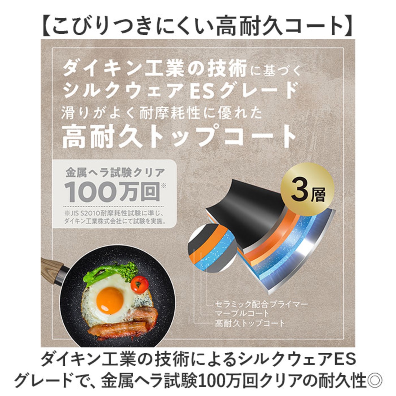 ・ダイキン工業の技術によるシルクウェアESグレードで、金属ヘラ試験100万回クリアの耐久性◎