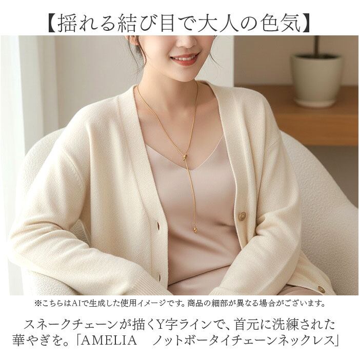 ・スネークチェーンが描くY字ラインで、首元に洗練された華やぎを。「AMELIA ノットボータイチェーンネックレス」