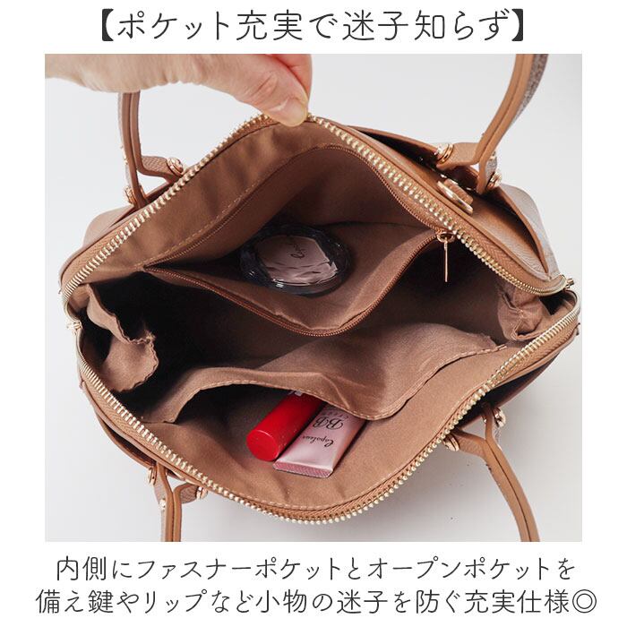 ・内側にファスナーポケットとオープンポケットを備え鍵やリップなど小物の迷子を防ぐ充実仕様◎
