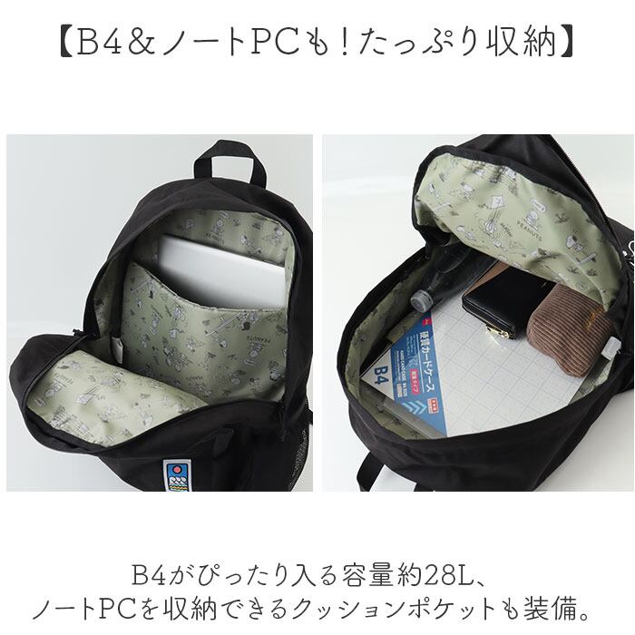 ・B4がぴったり入る容量約28L、ノートPCを収納できるクッションポケットも装備。