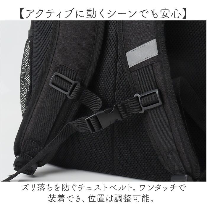 ・ズリ落ちを防ぐチェストベルト。ワンタッチで装着でき、位置は調整可能。