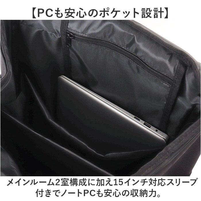 ・メインルーム2室構成に加え15インチ対応スリーブ付きでノートPCも安心の収納力。
