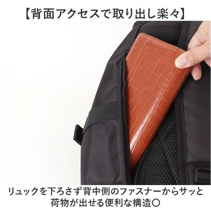 ・リュックを下ろさず背中側のファスナーからサッと荷物が出せる便利な構造〇
