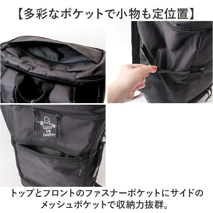 ・トップとフロントのファスナーポケットにサイドのメッシュポケットで収納力抜群。