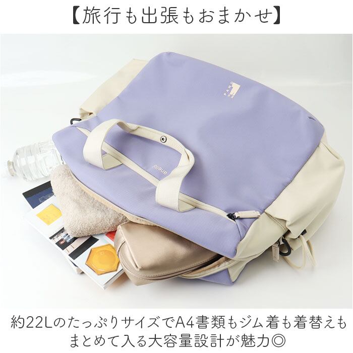 ・約22LのたっぷりサイズでA4書類もジム着も着替えもまとめて入る大容量設計が魅力◎