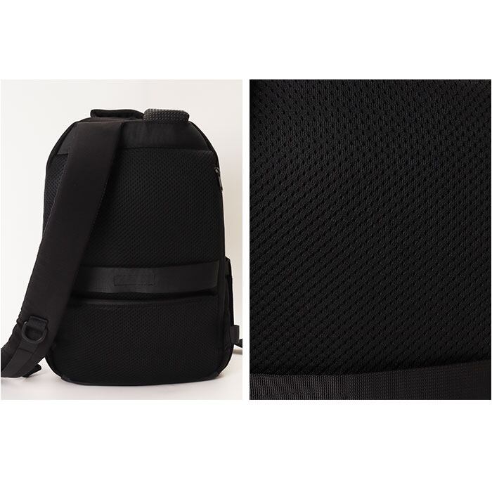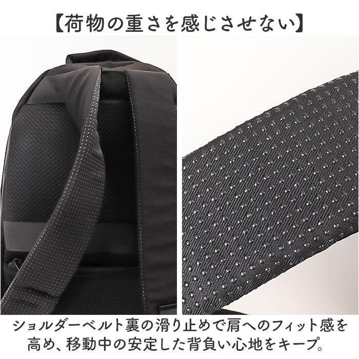・ショルダーベルト裏の滑り止めで肩へのフィット感を高め、移動中の安定した背負い心地をキープ。