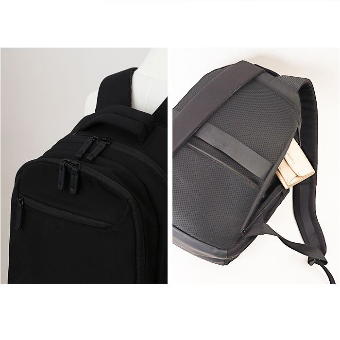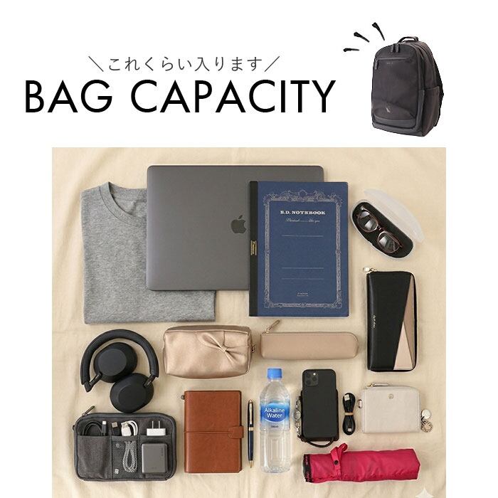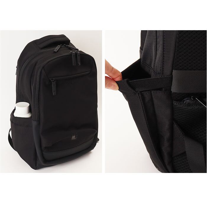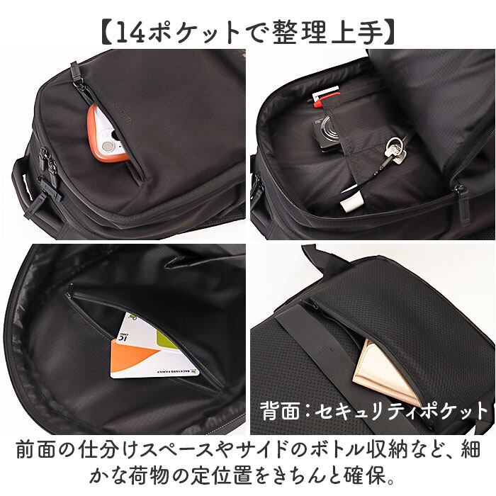 ・前面の仕分けスペースやサイドのボトル収納など、細かな荷物の定位置をきちんと確保。背面のセキュリティポケットで貴重品も安全♪