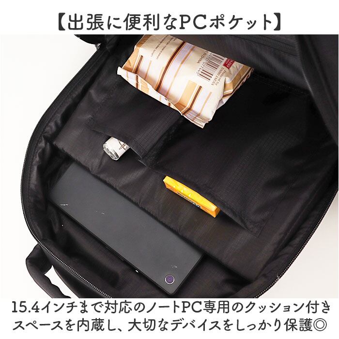 15.4インチまで対応のノートPC専用のクッション付きスペースを内蔵し、大切なデバイスをしっかり保護できる構造◎