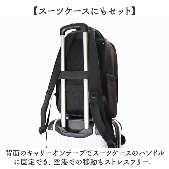・背面のキャリーオンテープでスーツケースのハンドルに固定でき、空港での移動もストレスフリー。
