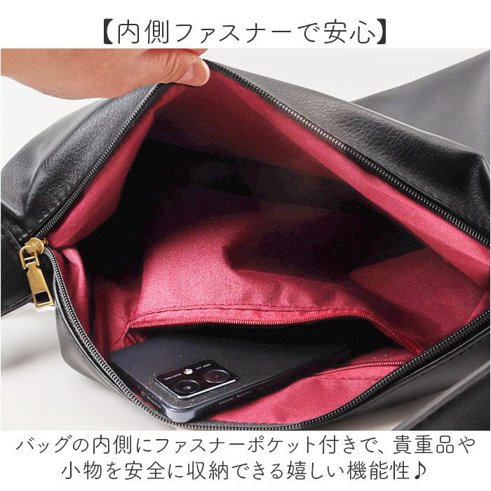 ・バッグの内側にファスナーポケット付きで、貴重品や小物を安全に収納できる嬉しい機能性♪