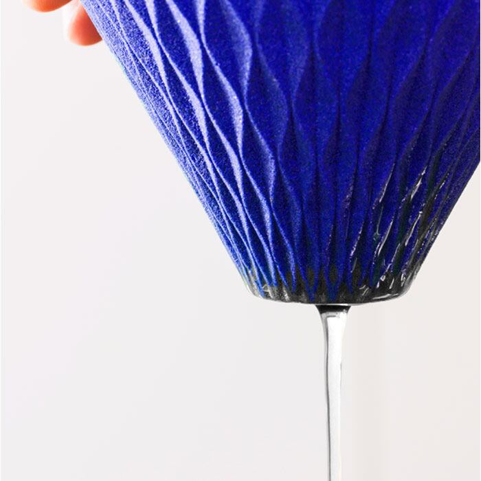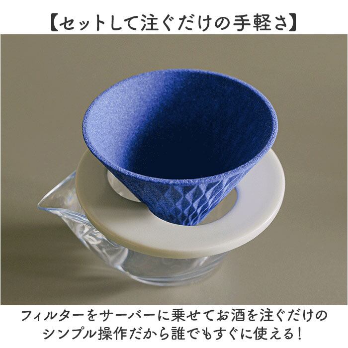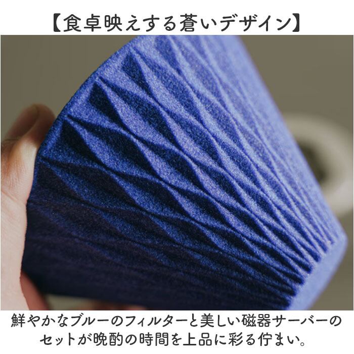 ・鮮やかなブルーのフィルターと美しい磁器サーバーのセットが晩酌の時間を上品に彩る佇まい。