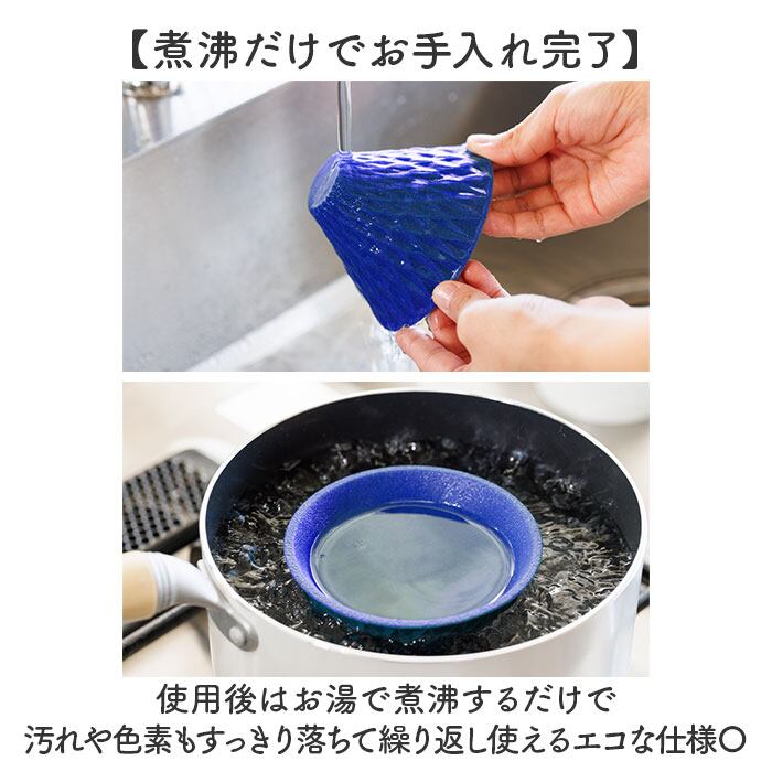 ・使用後はお湯で煮沸するだけで汚れや色素もすっきり落ちて繰り返し使えるエコな仕様〇