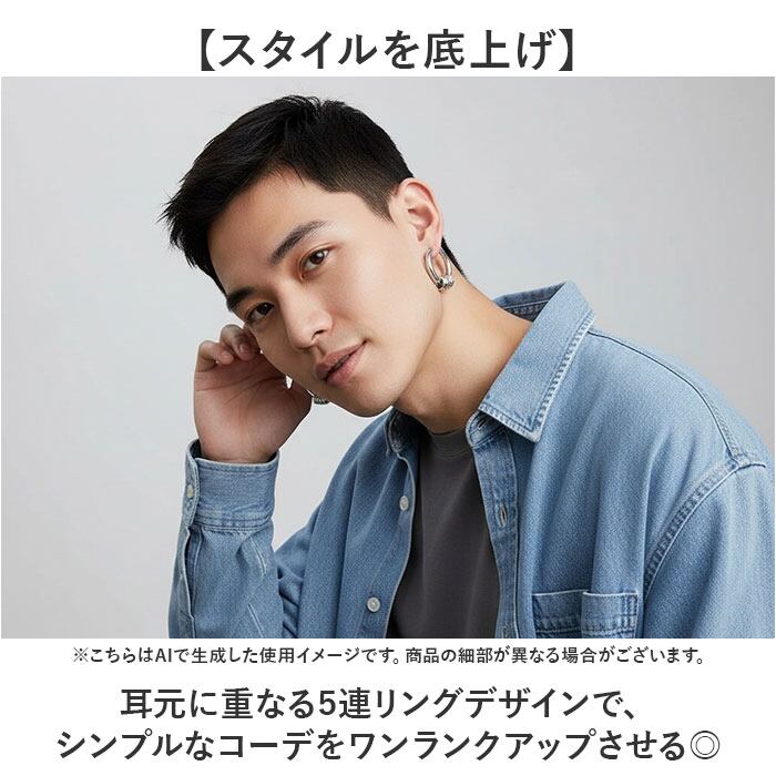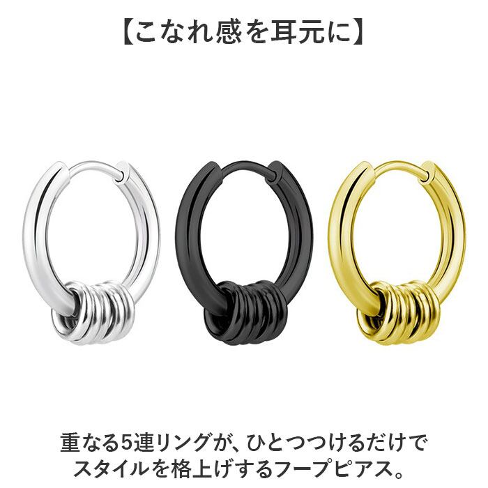 ・重なる5連リングが、ひとつつけるだけでスタイルを格上げするフープピアス。