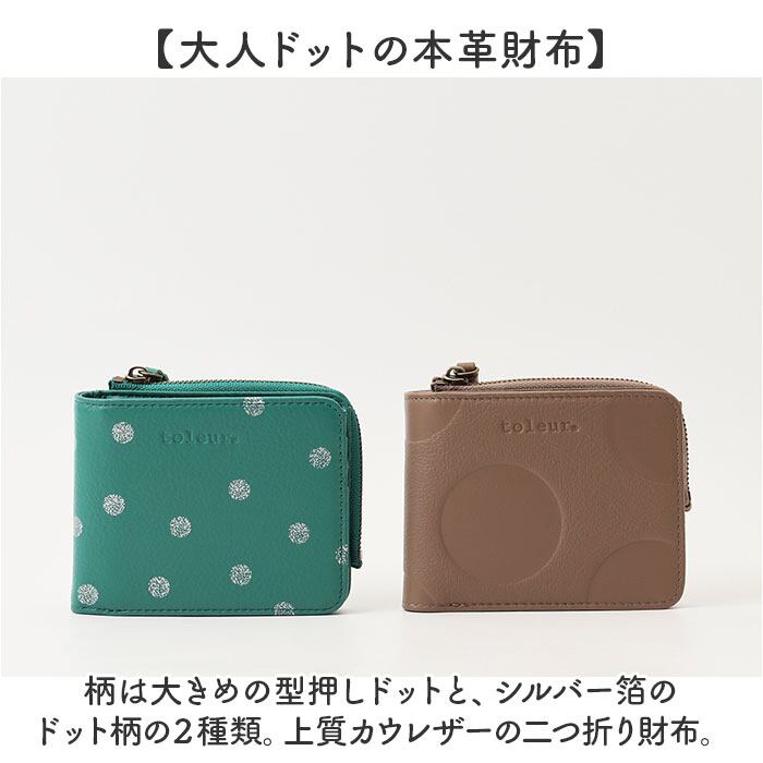 【大人ドットの本革財布】柄は大きめの型押しドットと、シルバー箔のドット柄の2種類。上質カウレザーの二つ折り財布。