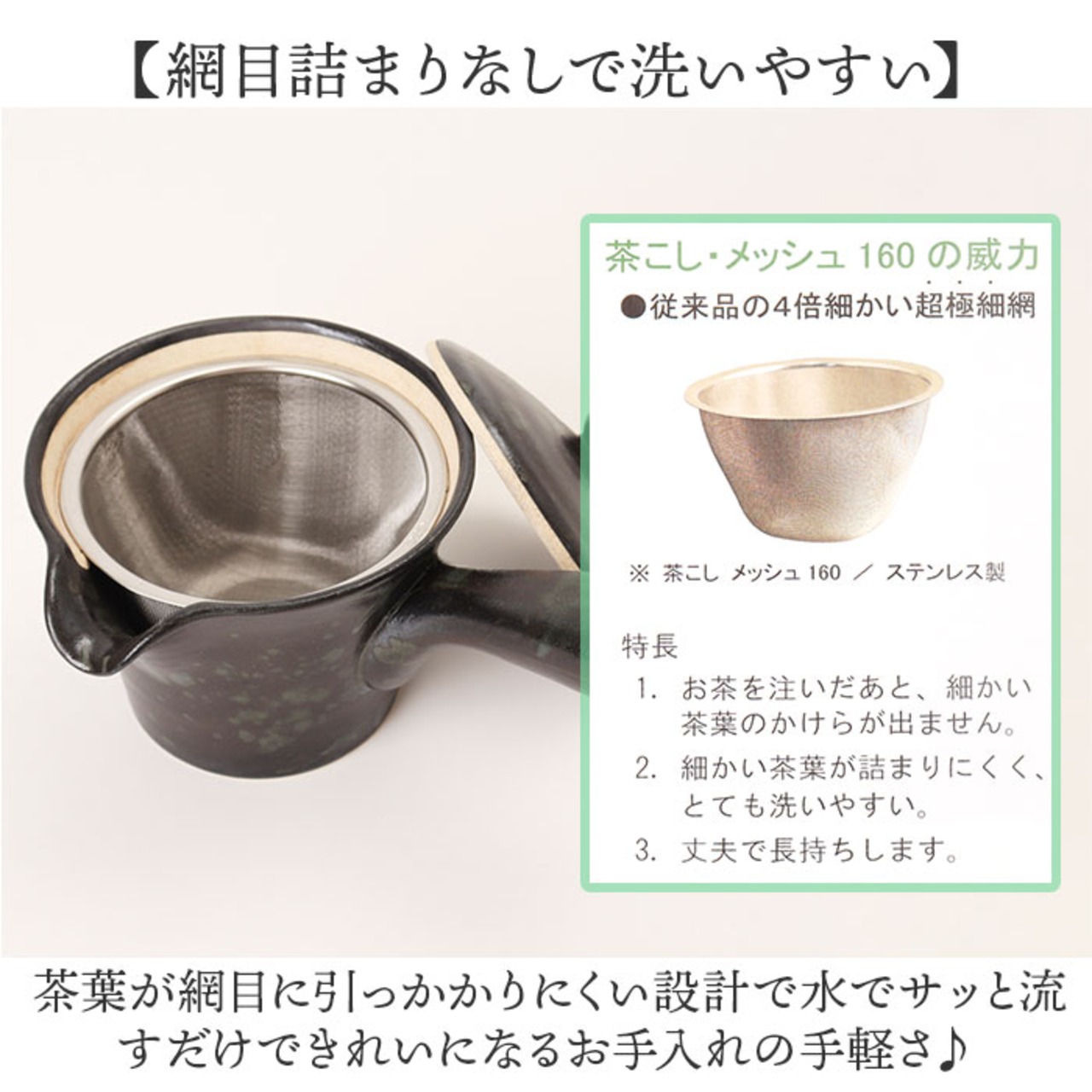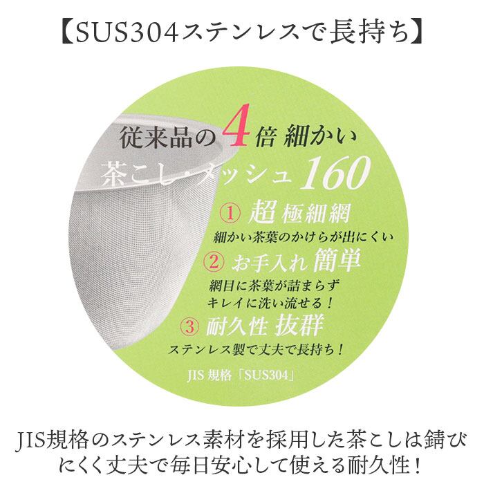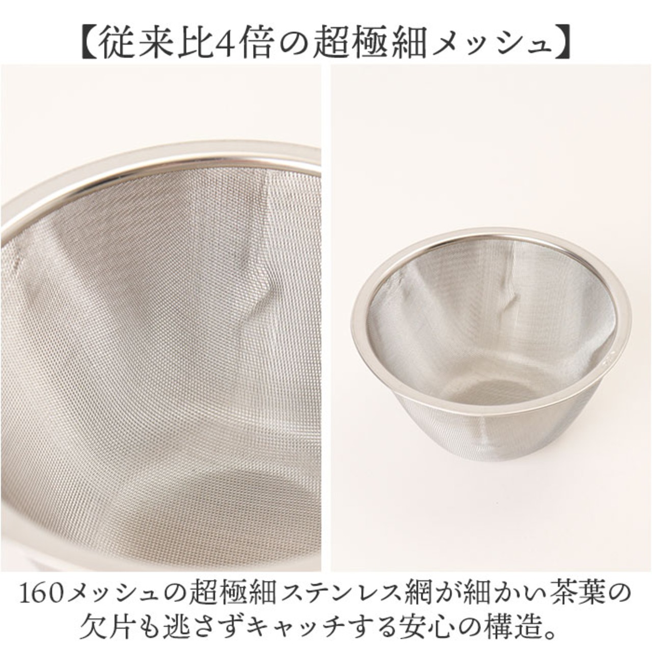 160メッシュの超極細ステンレス網が細かい茶葉の欠片も逃さずキャッチする安心の構造。