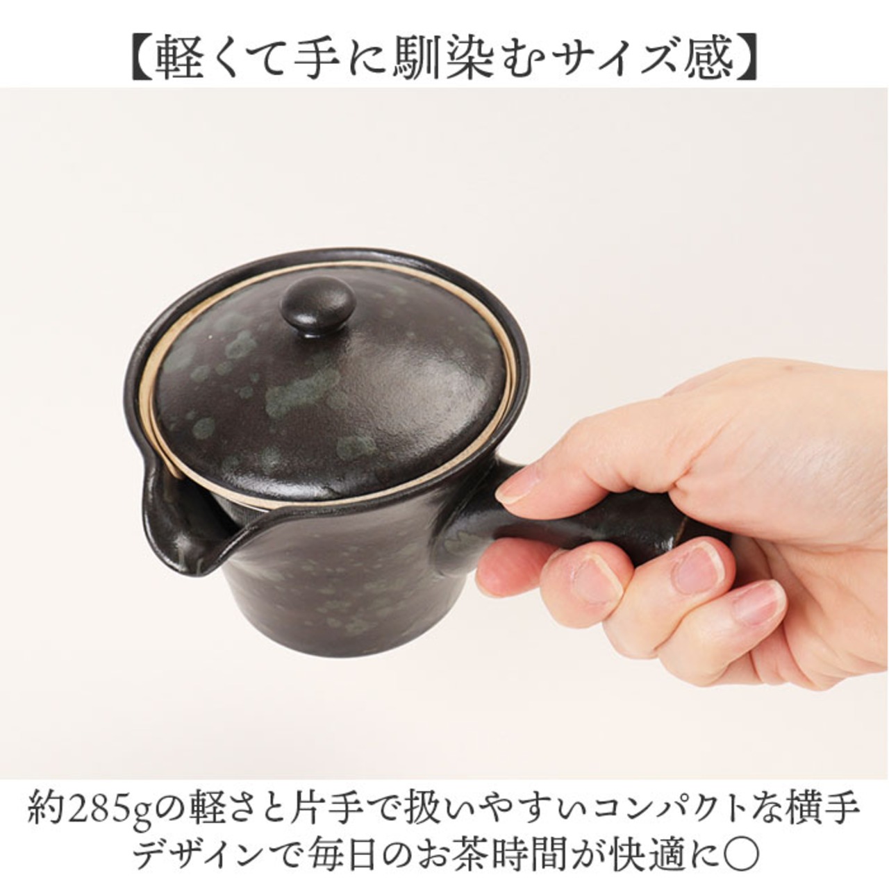 ・約285gの軽さと片手で扱いやすいコンパクトな横手デザインで毎日のお茶時間が快適に〇