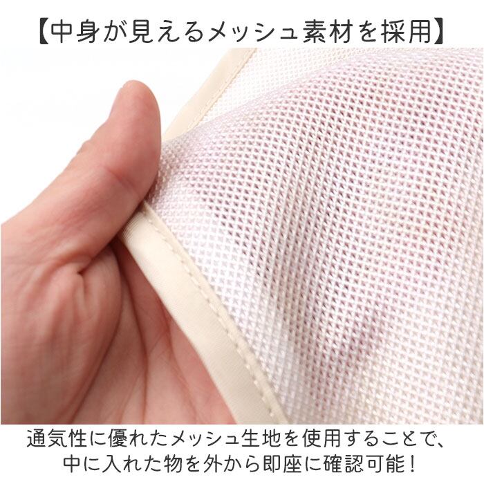 ・通気性に優れたメッシュ生地を使用することで、中に入れた物を外から即座に確認可能!